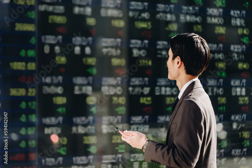 電光掲示板の株価ボードで銘柄を確認しスマートフォンで取引を注文し資産運用するビジネスマン