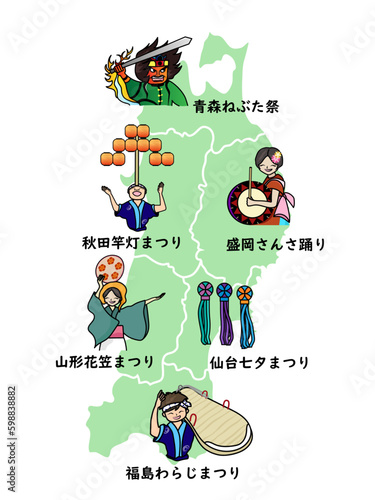 東北六県の地図とお祭りのイラスト