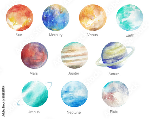 水彩で描いた太陽、地球、惑星のイラストセット 挿絵 背景イラスト
