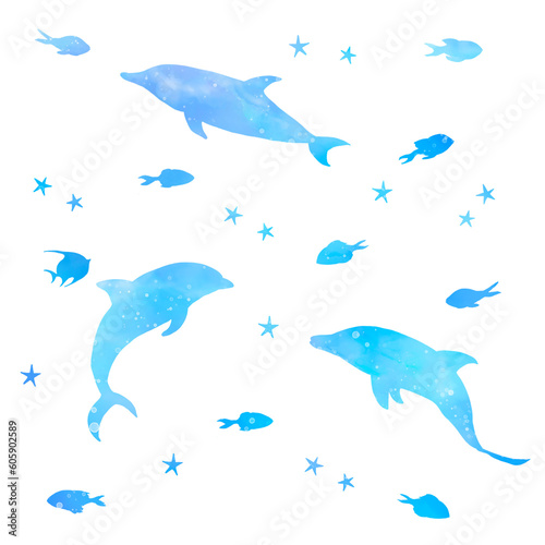 イルカと魚のマリンカラーシルエット。夏向けの素材セット。