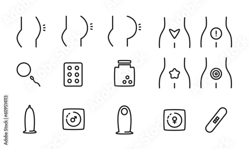 妊娠と避妊を表すイラストのセット/受胎/妊婦/コンドーム/ピル/妊娠検査薬/ベクター/アイコン
