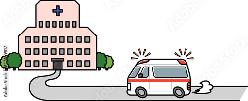 働く車・病院へ向かって緊急走行する救急車 イラスト.