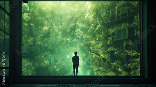 暗い森、廃墟にいる男性