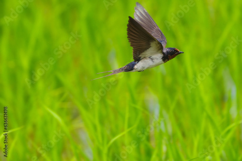 親ツバメと幼鳥が初夏の水田を飛び回る燕の飛翔シーン