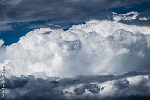 夏空に湧く積雲の壁近くを飛ぶ旅客機の点景