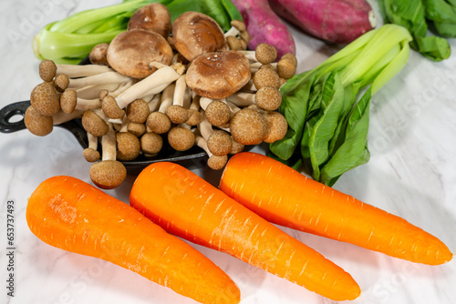 人参と椎茸とシメジとチンゲンサイとサツマイモ