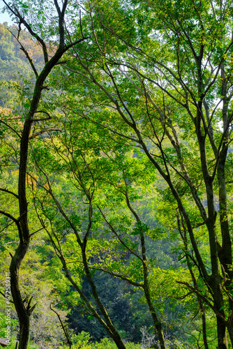 森の中の風景。六甲山の登山道で森林浴を楽しむ。