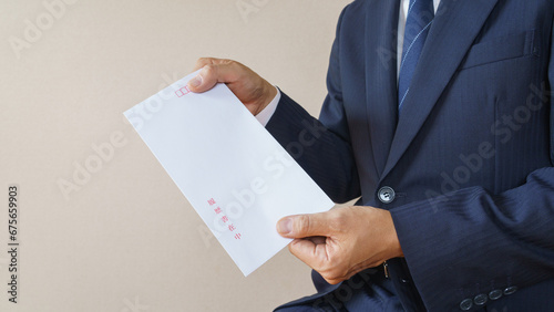 日本語の履歴書在中(朱書き)の封筒とビジネスマン│就職活動・転職活動イメージ