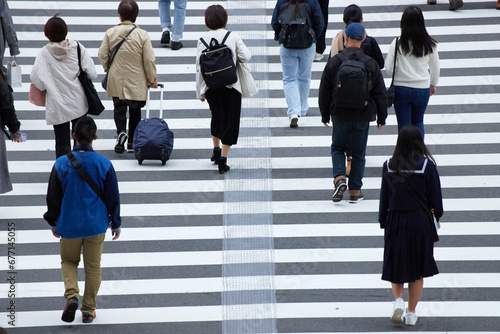 都市の交差点の横断歩道を渡る人々の姿