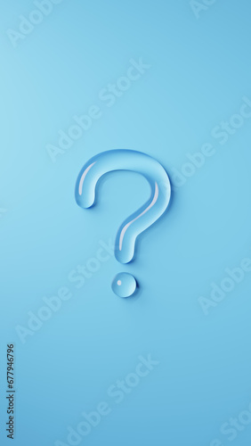 水色背景に立体的なクエスチョンマーク。ガラスのような透明の疑問符。(縦長)