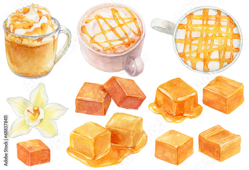 キャラメルマキアートとキャラメルの素材集 水彩画 ラテ カフェの飲み物