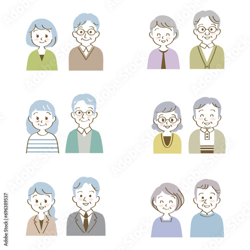 ポジティブ:イラスト素材セット:笑顔で仲良く正面を向いたシニア男女夫婦、パートナー(バストアップ/手描き線)
