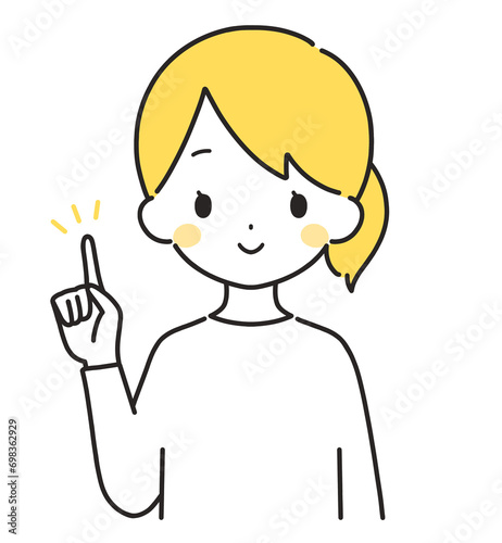 黄色|指差しをする私服の女性|上半身