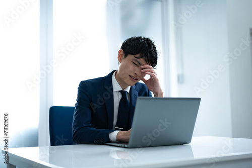 社内でパソコン作業をしながら悩む若いビジネスマン