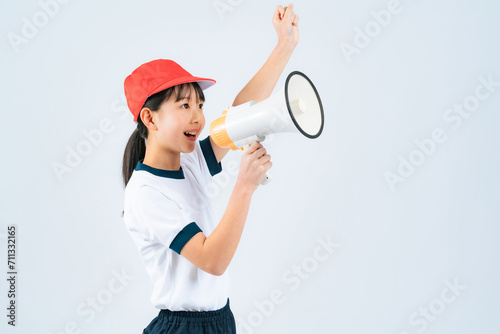 拡声器で応援する体操服を着た女の子