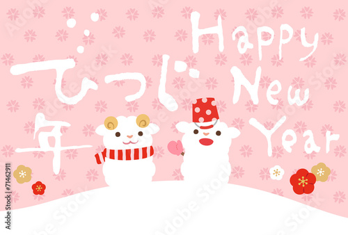 羊の雪だるまの年賀状テンプレート(ピンク)