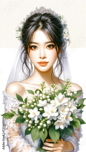 ウエディングドレスでジャスミンのブーケを持つ日本人の美しい花嫁