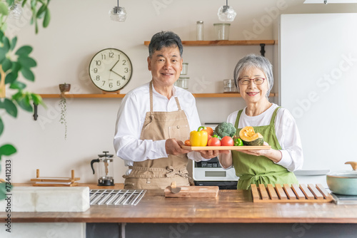 野菜を持つ日本人の高齢者夫婦(シニア老夫婦)