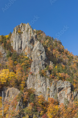 日本 北海道札幌市南区定山渓にある豊平峡ダムから見える渓谷と千丈岩と紅葉