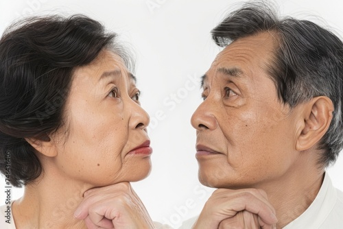 考えている日本人の初老の夫婦(白背景・老後・介護・健康・年金・将来)