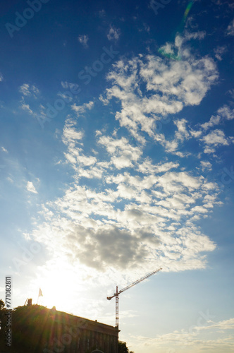 工事中の建物と眩しい太陽光