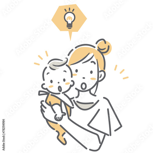 情報に驚く赤ちゃんを抱っこしたお母さん シンプルでお洒落な線画イラスト