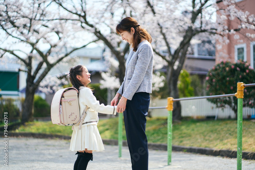 桜の咲く公園で手を繋いで見つめ合う日本の母と娘
