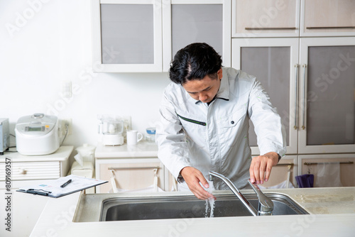 シンク、水回りの点検する業者、日本人男性