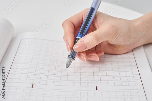 万年筆を持つ女性の手と原稿用紙