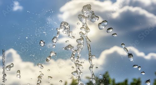 夏の太陽にキラキラ輝きさわやかな青空に飛び散る細かい水の滴と水しぶき 夏休み・水遊び・水鉄砲・プール・海・潮・公園