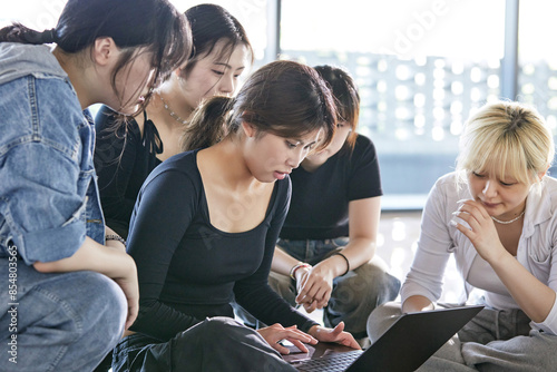 앉아서 태블릿을 보며 모니터를 하는 여성 댄서들