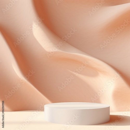 布風の形の淡いテラコッタの背景と白く丸い展示台がある正方形抽象バナー