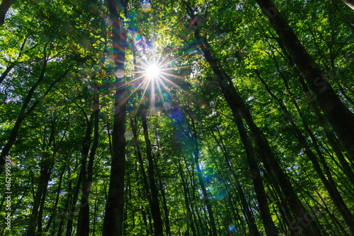 春の新潟県十日町市の美人林と呼ばれる美しい緑の林の木漏れ日