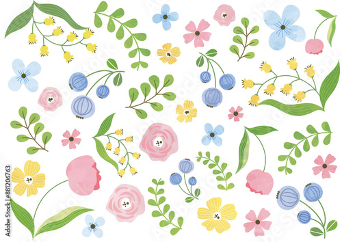 手描き北欧風の淡い水彩がお洒落馬優しいパステルカラーのボタニカルな花と植物のイラストセット