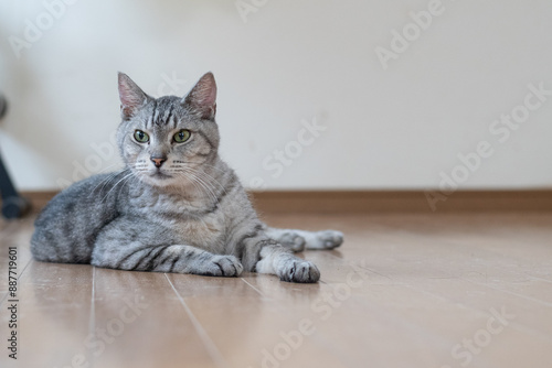 床に寝そべる猫 サバトラ猫