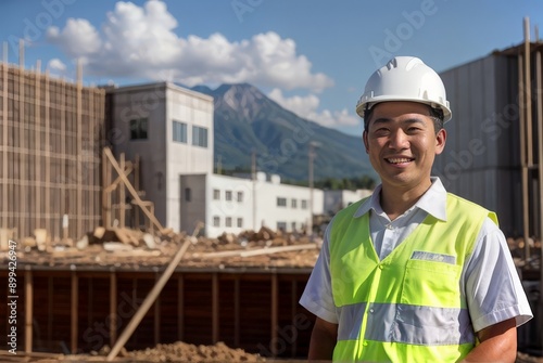屋外建設現場のエンジニア男性が自身に満ちた笑顔をうかべる。マネージャー、施工管理者