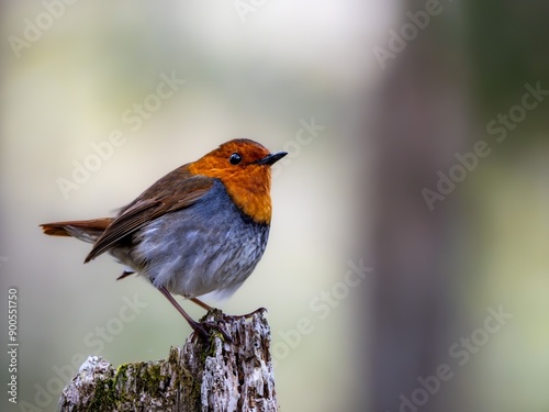 森の中で枯れ木に留まっているコマドリの雄