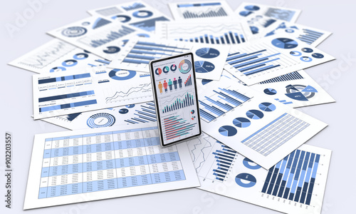 スマートフォンとビジネス資料、ビジネスの検証、検討、計画イメージ