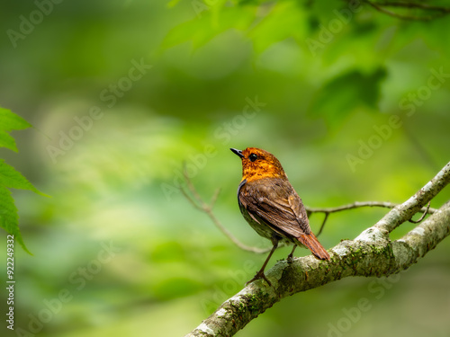 森の中で水浴びの後に枝に飛び乗ったコマドリの雄