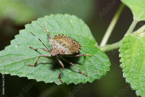 主に果樹への農業害虫であるクサギカメムシの成虫(カラムシ葉上、自然光+ストロボ、マクロ接写撮影)