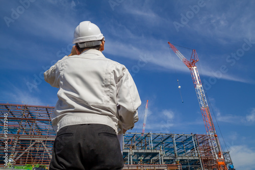 青空を背景にビル工事現場を見つめる作業着を着た男性技師の後ろ姿。