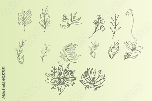 フローラル・草・花の線画イラストデザインセット