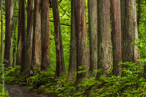 日本 長野県長野市にある戸隠神社の奥社の杉並木の参道と奥社院坊跡