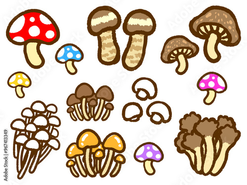 様々な種類の秋のキノコの落書き風イラスト素材セット
