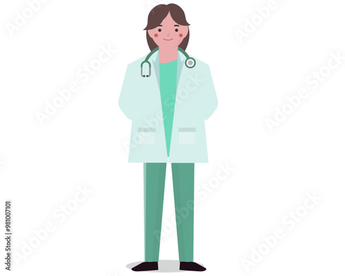 白髪のベテラン医師の女性。立っている信頼感のある白衣を着た医者。ベクターイラスト