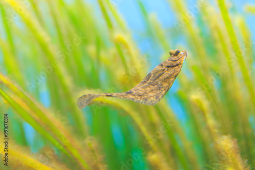 マコガレイ, 真子鰈, 城下かれい, カレイ科, アマモ, 甘藻, アマモ場, 種子植物, 幼魚, 海草, 藻類, 海藻, 水族館, 水族園, アクアリウム, フィッシュウォッチング, 魚, 海水魚, 魚類, 魚介類, 小魚, 動物, 生き物, 生物, 鑑賞魚, 生態, 水槽, 観光, アクア, 風景, 水中, 海中, 可愛い, 癒し, 海, 水中写真, 綺麗, 泳ぐ, 茶色, 黒褐色, イメージ