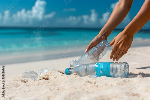 環境保護活動。ビーチでゴミを拾う人々の様子。清掃の手元風景。