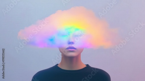 カラフルな夢の風景:創造的なインスピレーションのために鮮やかな虹の雲に囲まれた人