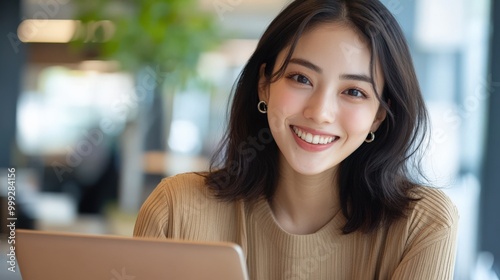 モダンなオフィス環境で楽しく働く日本のプロフェッショナル女性