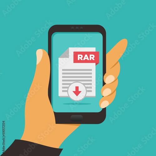 File download button on smartphone screen. Hand holds smartphone, finger touches button. Downloading document concept for web banners, web sites, infographics. Creative flat design vector illustration